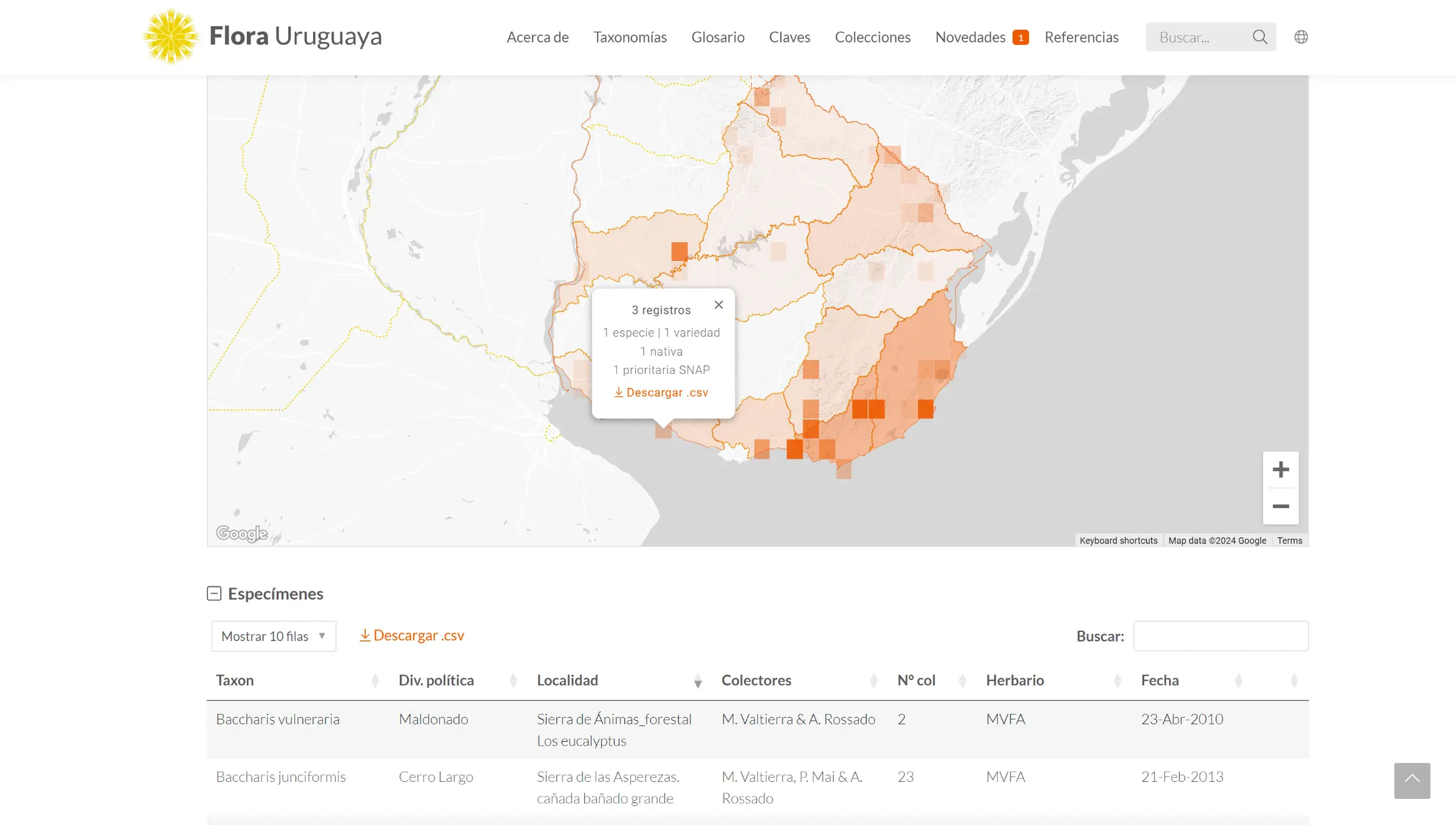 Mapas de distribución: Muestra la distribución espacial de especímenes recolectados, con opciones de filtrado por departamento o cuadrículas de 10 km.