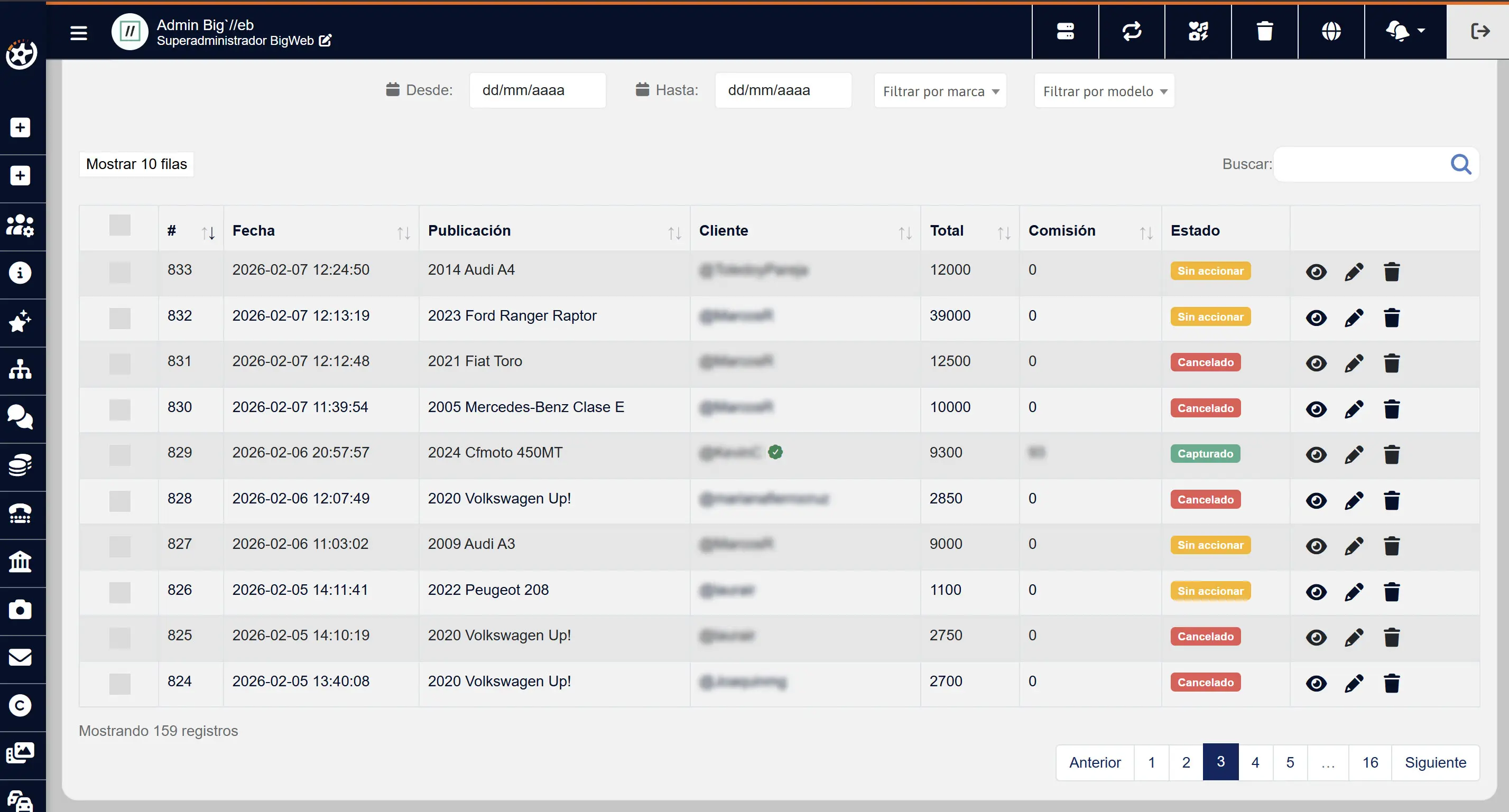 El panel de administración de Ruedas y Subastas permite gestionar de forma centralizada usuarios, vehículos, ofertas, estados de subastas y comunicaciones. Desde el sistema se pueden modificar y aprobar publicaciones, monitorear subastas en tiempo real, capturar o cancelar pagos, configurar parámetros y reglas del sitio, y administrar todos los contenidos dinámicos del sitio.