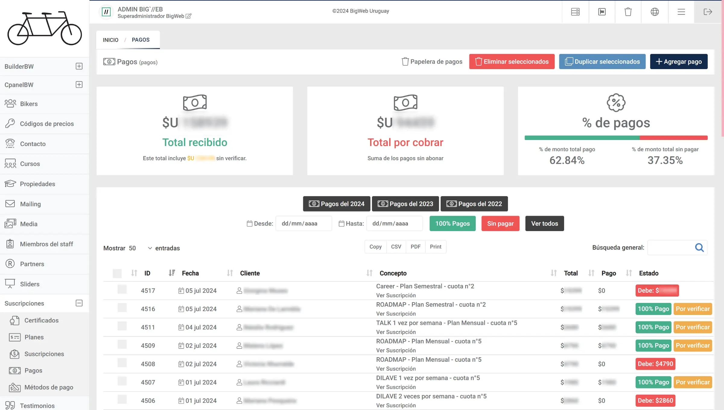 ]El panel de administración de BIKE permite gestionar planes de estudio con sus duraciones, cantidades de cuotas y precios, así como los cursos y su respectivo contenido. También facilita la administración de datos personales y el historial de los alumnos, incluyendo la emisión de facturas y diplomas. El sistema maneja pagos recibidos y pendientes, y permite enviar emails masivos de anuncios y correos individuales con branding personalizado. El panel también administra los miembros del staff, partners y testimonios del sitio web, proporcionando una solución completa para la gestión de la escuela.