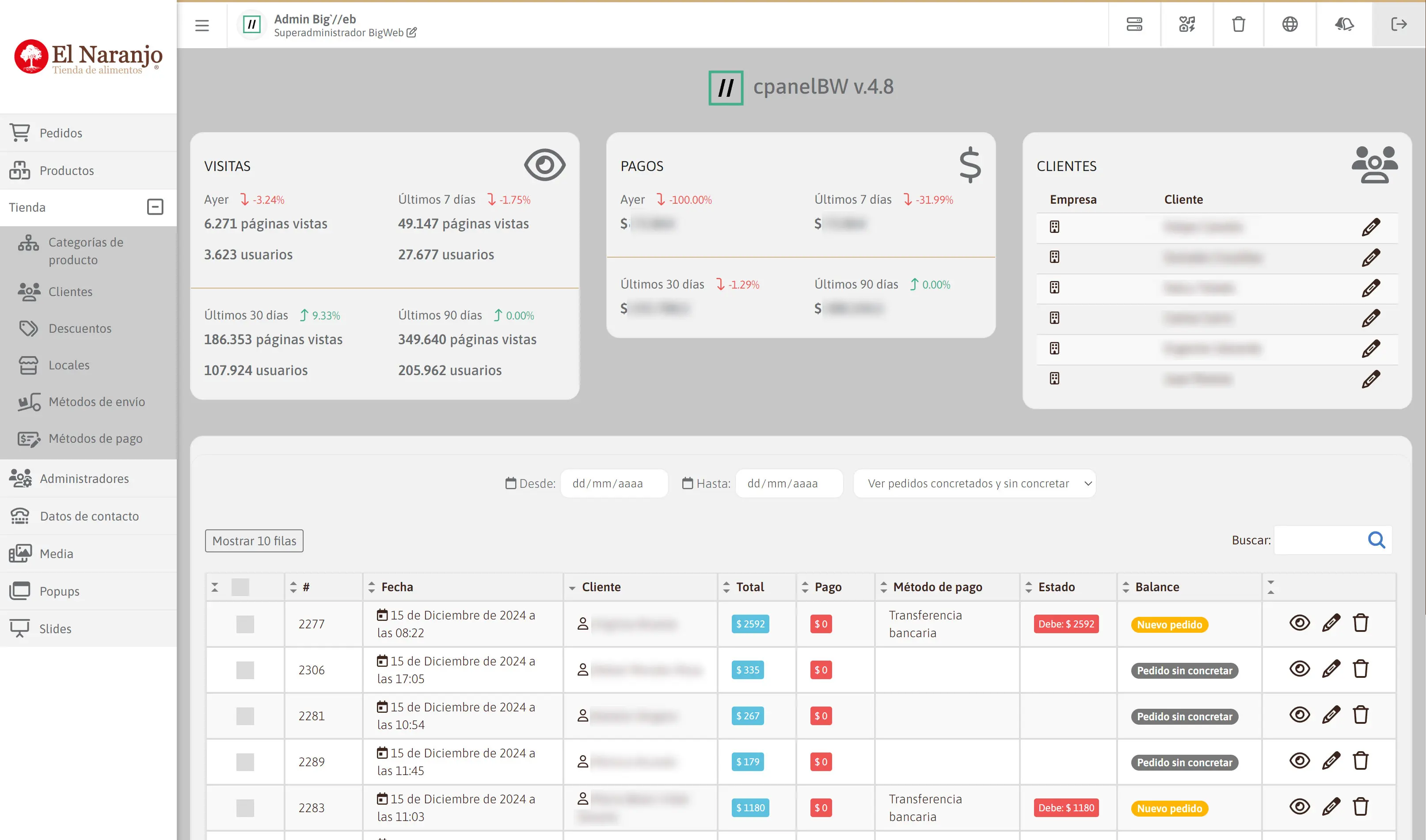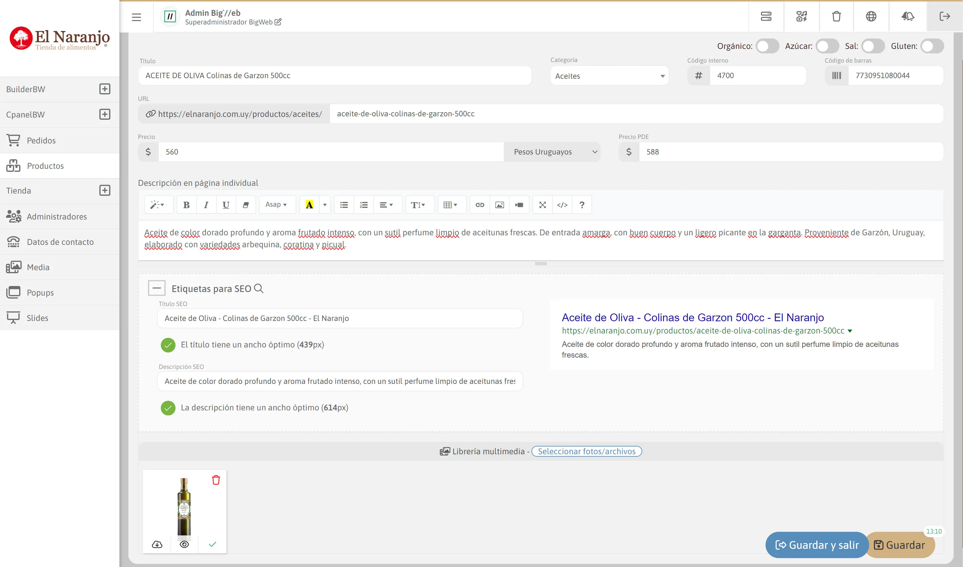 ]El panel de administración de ElNaranjo.com.uy permite gestionar de manera eficiente productos, categorías, pedidos, facturas, envíos y promociones. Además, el sistema incluye una funcionalidad avanzada para sincronizar los precios y el inventario directamente con el sistema interno de la empresa. Esto se realiza mediante la carga de una plantilla de Excel que permite actualizar precios, agregar nuevos productos y dar de baja o inactivar aquellos que ya no estén disponibles. Este enfoque simplifica la gestión operativa y mantiene la tienda siempre actualizada.