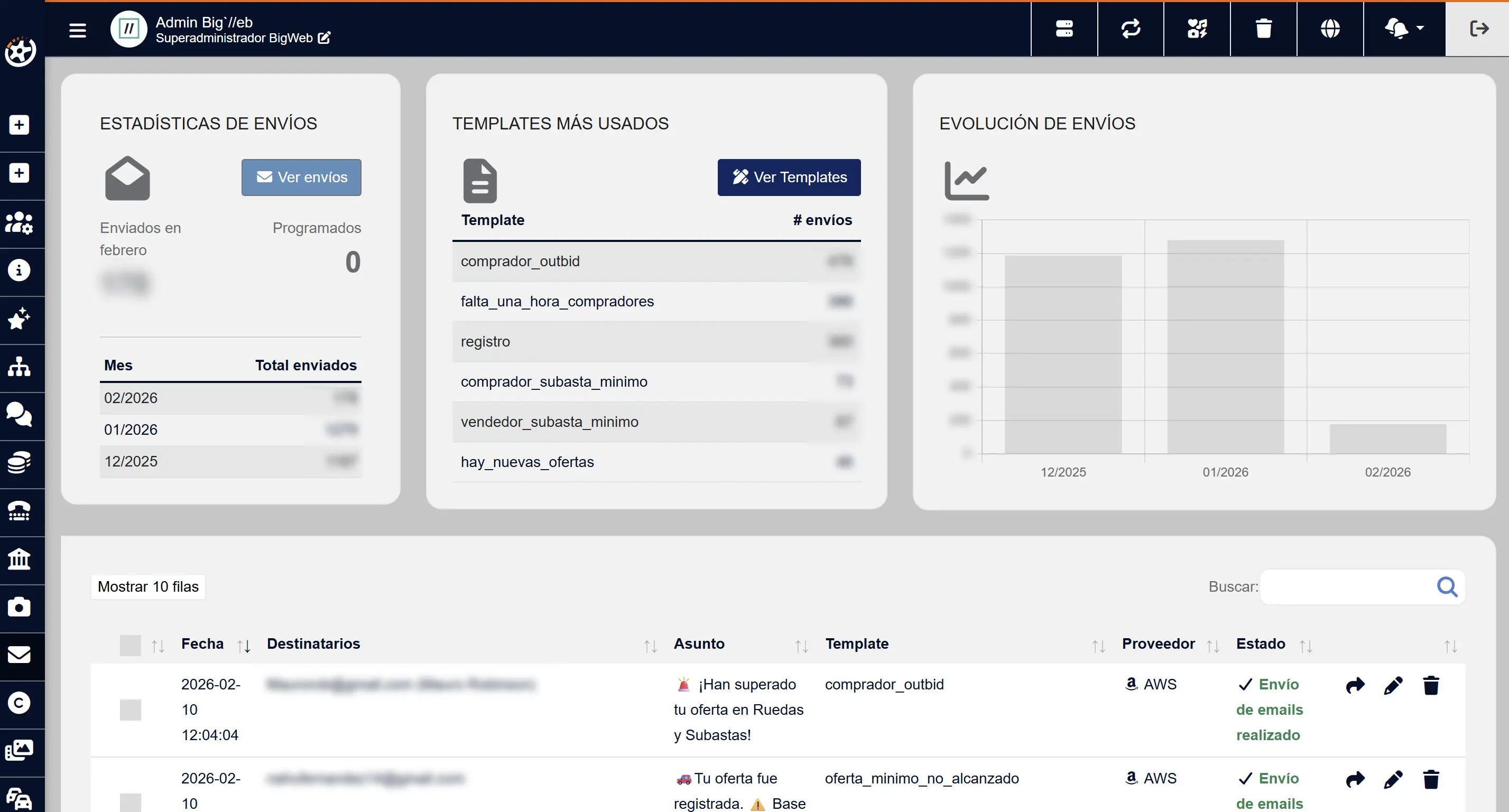 ruedasysubastas.com es una plataforma digital especializada en la compraventa de vehículos mediante subastas online, diseñada para conectar vendedores y compradores de forma transparente, segura y eficiente. En BigWeb desarrollamos una solución tecnológica integral que va mucho más allá de un sitio web, incorporando lógicas complejas de negocio, automatización de procesos y sistemas de pago y comunicación masiva.