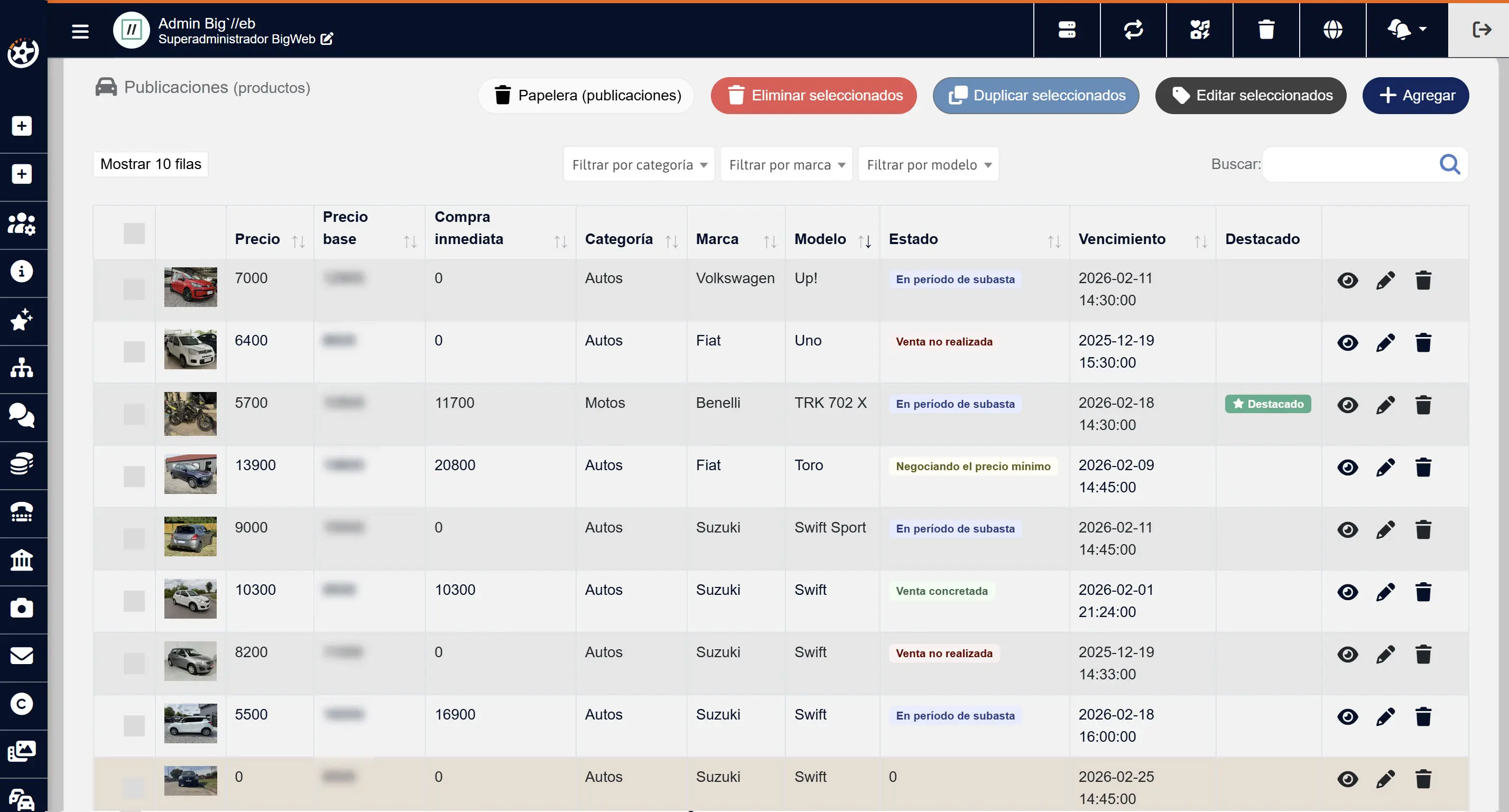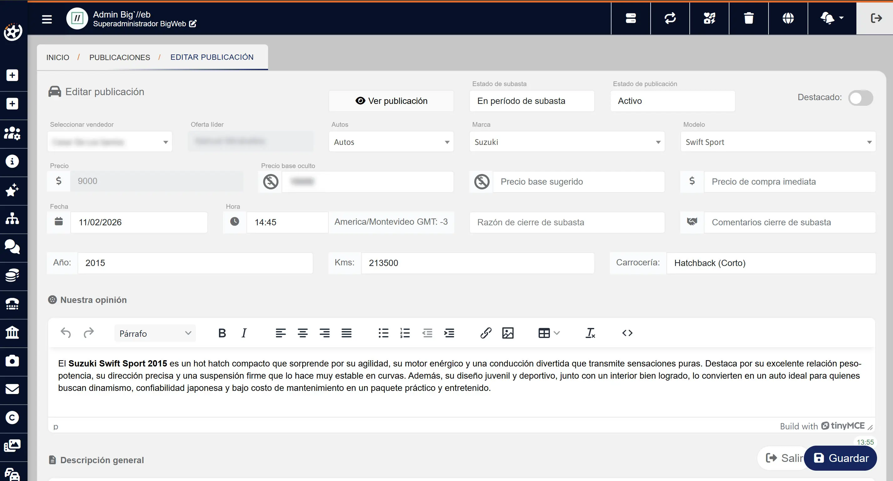 El panel de administración de Ruedas y Subastas permite gestionar de forma centralizada usuarios, vehículos, ofertas, estados de subastas y comunicaciones. Desde el sistema se pueden modificar y aprobar publicaciones, monitorear subastas en tiempo real, capturar o cancelar pagos, configurar parámetros y reglas del sitio, y administrar todos los contenidos dinámicos del sitio.