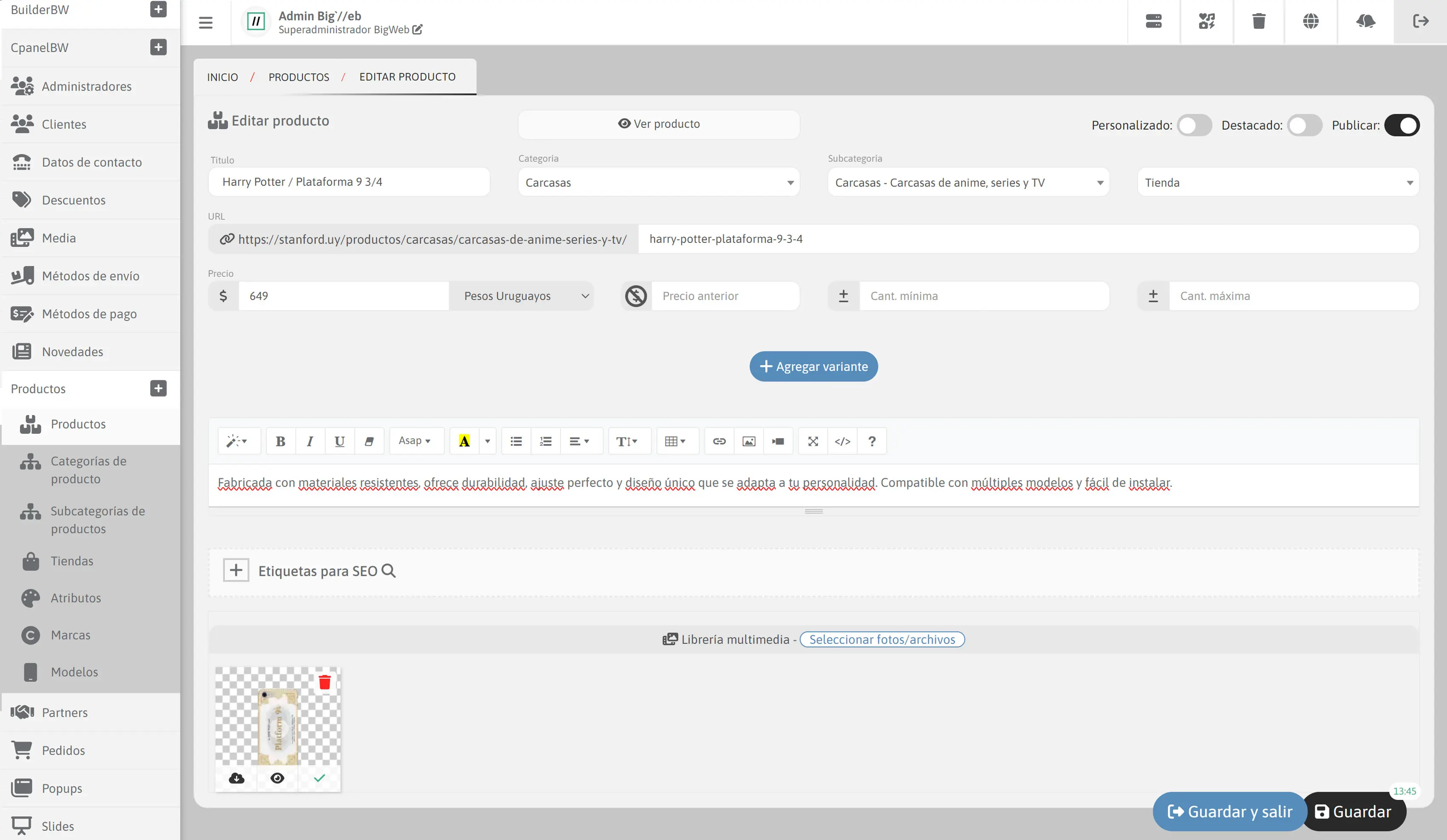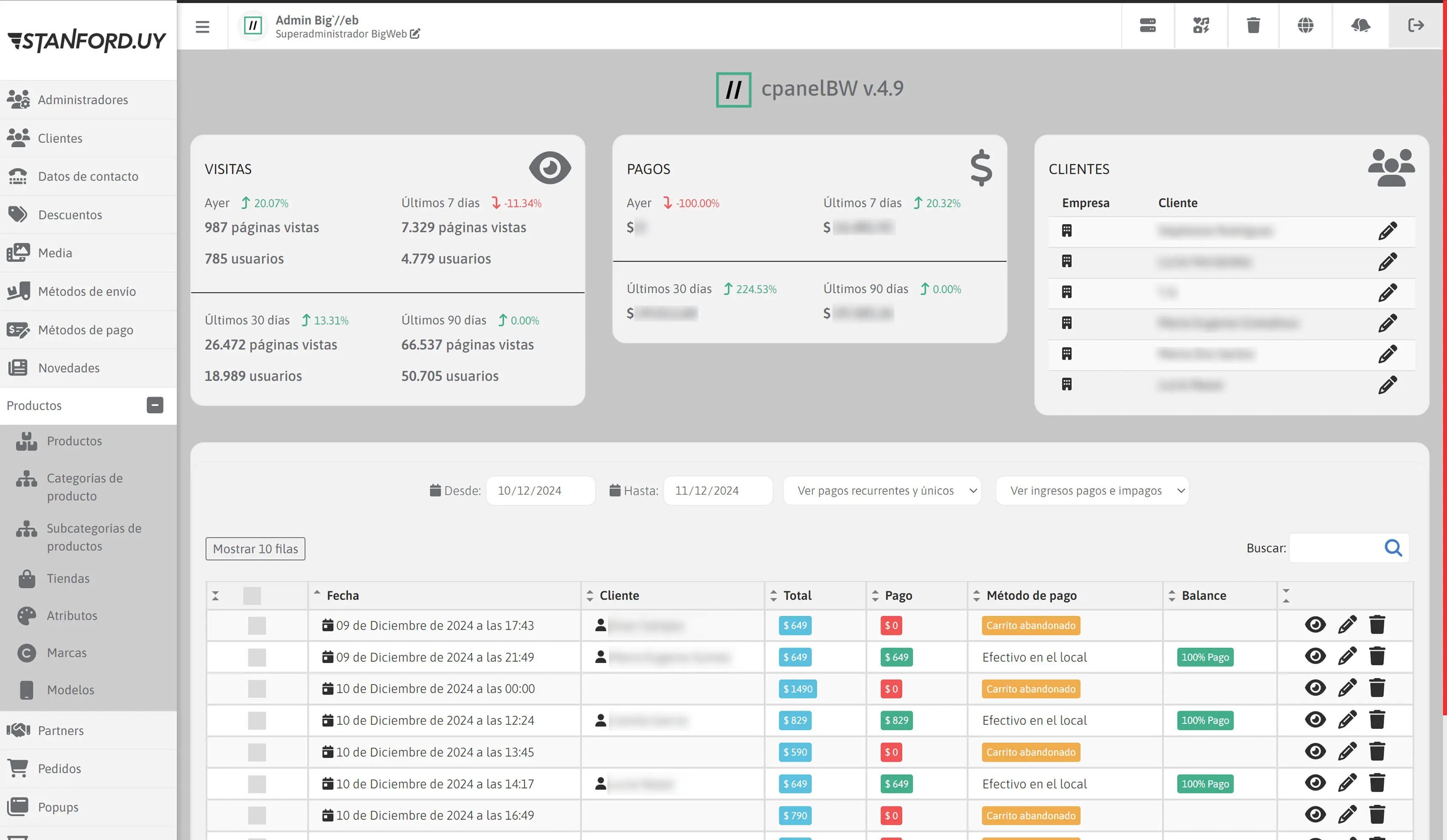 ]El panel de administración de Stanford.uy proporciona un control integral de la tienda online mediante una interfaz intuitiva y eficiente. Desde allí, el administrador puede gestionar clientes, supervisar y actualizar pedidos en todos sus estados, y rastrear carritos abandonados para maximizar las ventas. También permite una gestión completa de productos, incluyendo sus variantes, atributos y características. Además, es posible configurar métodos de envío personalizados por zonas, gestionar métodos de pago con distintas comisiones, actualizar datos de contacto y crear ofertas y descuentos, ya sea mayoristas o a través de cupones promocionales. Todo esto garantiza una operación fluida y una experiencia de administración completa y personalizada a medida.
